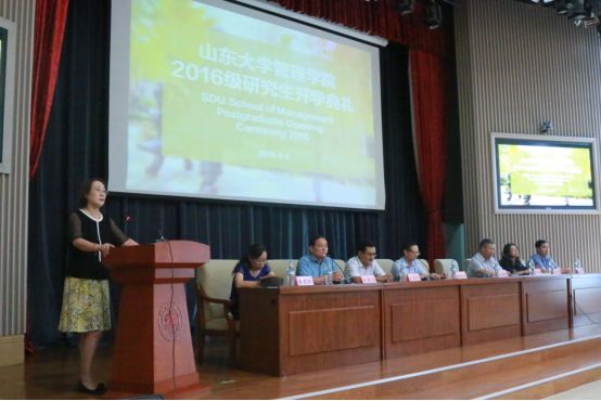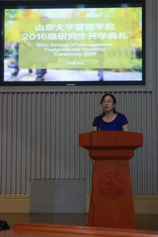 下午2点,管理学院2016级研究生开学典礼在知新楼3楼报告厅隆重举行,三百余名硕士新生参加了典礼。开学典礼由管理学院党委副书记石清云主持,院长杨蕙馨教授致欢迎辞。杨院长首先对2016级新生表示热烈地欢迎,同时对大家提出了严格的要求。 随后,导师代表潘爱玲教授发表讲话,从导师角度对同学们即将开始的学习生活提出中肯的几点建议,表达了老师们对新一届学生的殷切希望。