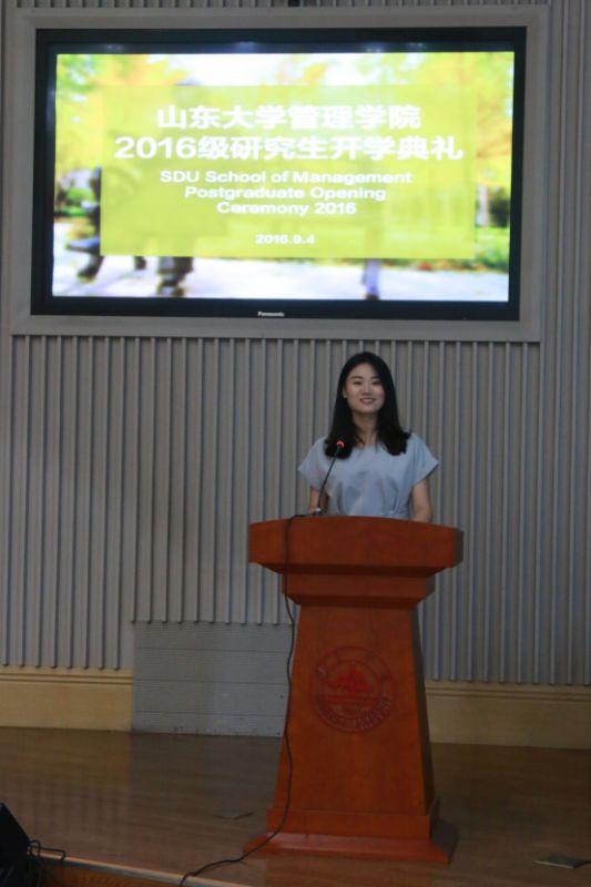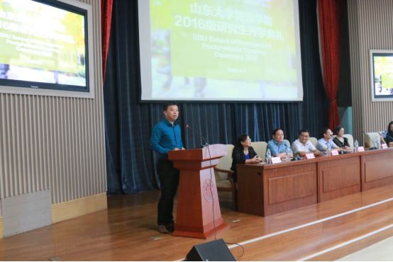 2015级博士研究生代表邱海龙同学作为前辈也跟大家分享了研究生阶段的学习经验,用幽默风趣的语言深入浅出地分析了研究生学习的特点和方法,为学弟学妹们指明了方向。最后,2016级学术型硕士生新生代表王喆同学及MBA新生代表刘峰同学分别作了精彩的演讲,充分向院领导展示了新一届学生的别样风采,激起了在座师生们阵阵喝彩。开学典礼在热烈的掌声中圆满结束。