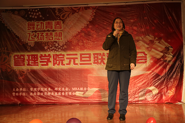 12月28日,管理学院2015年元旦联欢晚会在大学生活动中心成功举办。学院院长杨蕙馨、副院长戚桂杰、副院长潘爱玲、党委副书记石清云、办公室主任毕建增、以色列外教Ora Nebenzahi及多位研究生导师和负责学生工作的老师出席了本次晚会,管理学院与其他学院学生也参加了晚会。