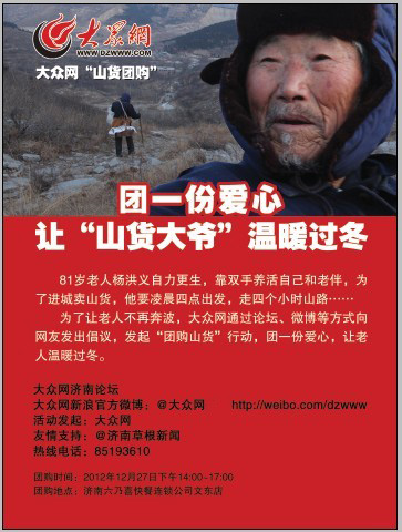 12月27日下午两点,大众网将在济南市文化东路六乃喜快餐店为“山货大爷”杨洪义老人举行团购活动。六乃喜快餐店老板作为我们山东大学MBA学员,为本次活动率先献出爱心,为本次活动设计制作了宣传海报,并在网上发起爱心倡议,为当天活动的热心人士、为“山货大爷”、相关工作人员、提供午餐、山货售卖场地等全方位支持。