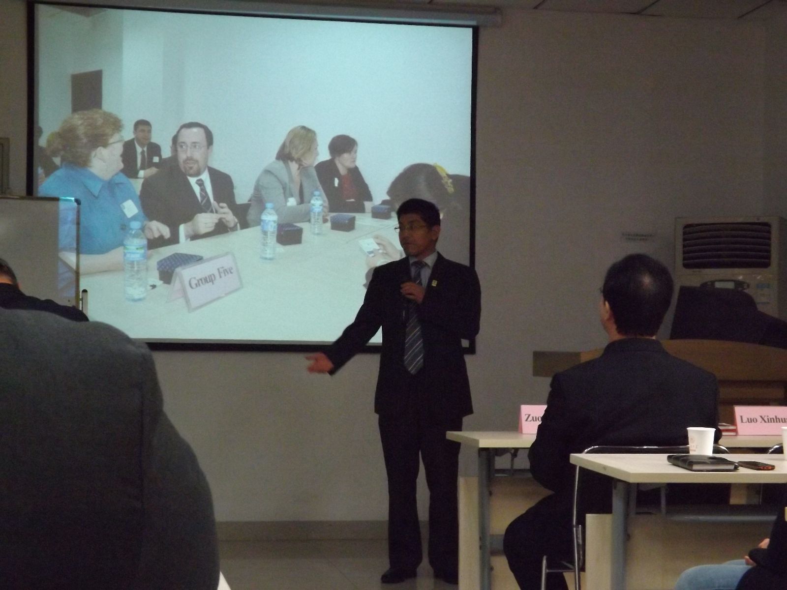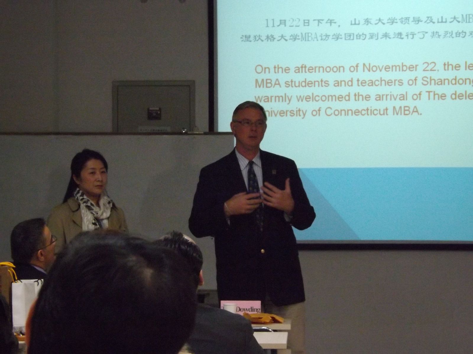 随后,Tim教授讲话,他非常感谢山大给予的热情接待,康州大学非常重视与山东大学的合作关系,两校间不仅有MBA学员的互访,还有教师的轮换任教,合作是多层面的。Tim教授还简要介绍了康州大学(UCONN)的历史与现状,康州大学成立于1881年,是美国国家一级大学,其综合实力在全美排名58位,学校在法律,医学,教育,商科方面具有一大批强势学科专业,尤其商学院在全美公立大学中排名位居前列并享有一定的声望。
