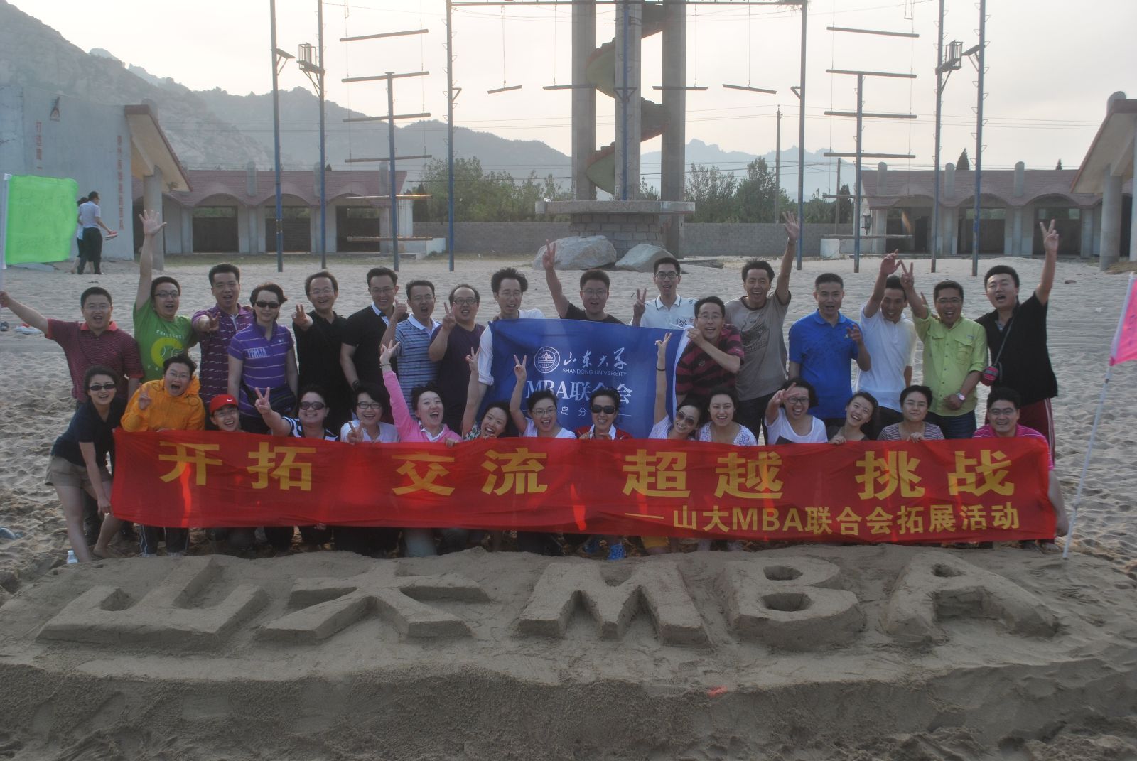 夕阳西下,海面波光粼粼,难忘的一天即将结束。沙滩上,学员们精心雕琢着一块硕大的阳刻LOGO——山大MBA。提水和沙、勾勒字框、去除冗余,一笔一划都是饱含深情。关峰手握DV,记录了每个人此刻的心声;大家纷纷将手印按在沙雕边缘,合影留念。望着气势恢宏的杰作,霎那间,自豪感和归属感油然而生。