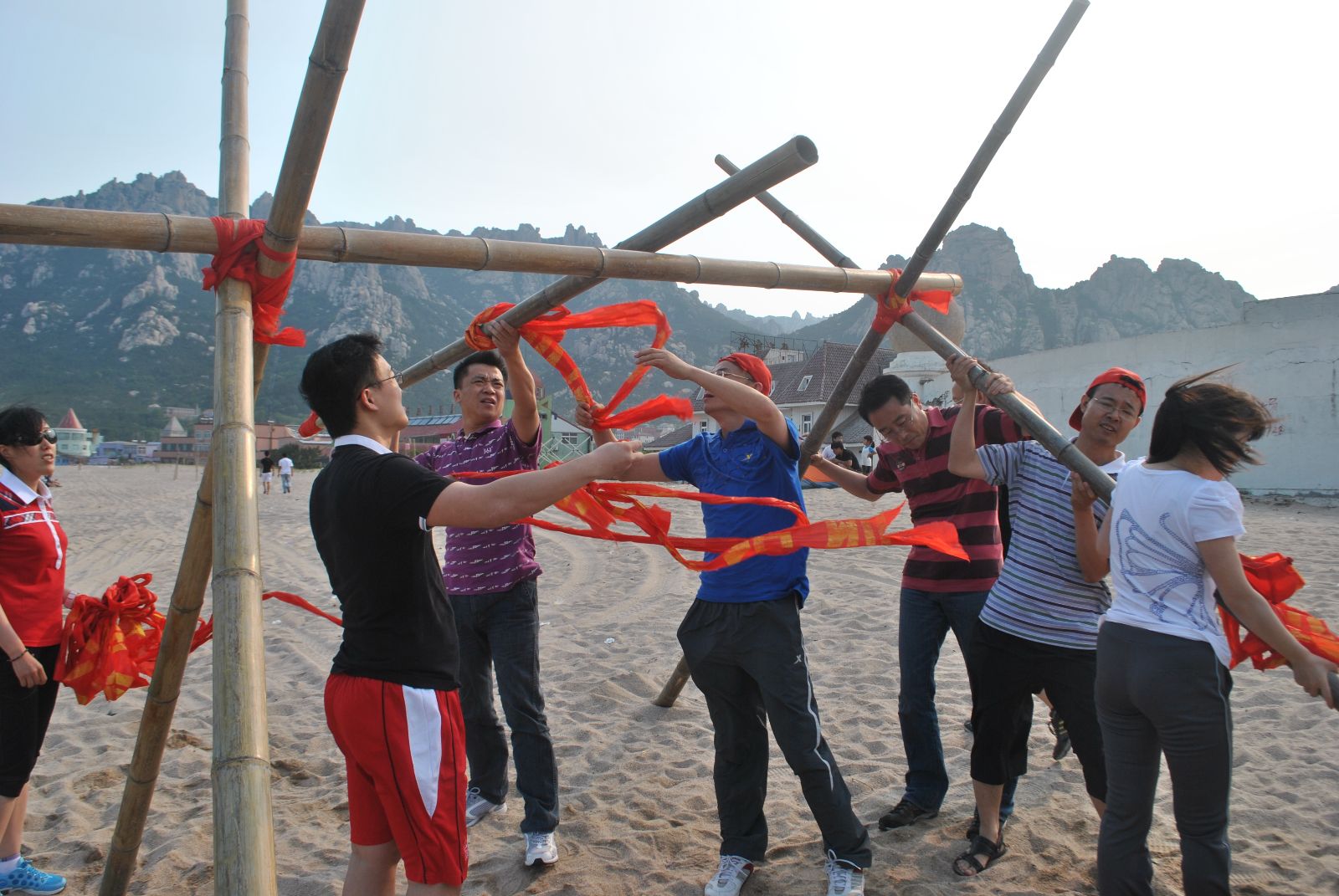 随后,学员们来到沙滩,进行“部落帝国”竞赛,要求是团队利用现有的六根毛竹、绳子制造一个古代战争用的投炮弹的工具,互相投掷炮弹(气球装水),投入对方的堡垒圈内最多者获胜。两队成员各自分工明确:男生制作投弹工具,女生制作炮弹。架好大炮、调整支点、丈量射程、安装炮弹、发射,“耶!”随着炮弹射出,不管炮弹是否击中对方阵地,都传来欢呼声。最终,“旷世英雄队”以17:13的成绩赢得胜利。团队的最终目的是要赢,而如何把团队的目标设定更远是重点问题。此项竞赛让学员们体会到团队中应该怎样整合资源以达到团队最大绩效的取得;体会到共同参与和充分发挥个体特长的重要作用。