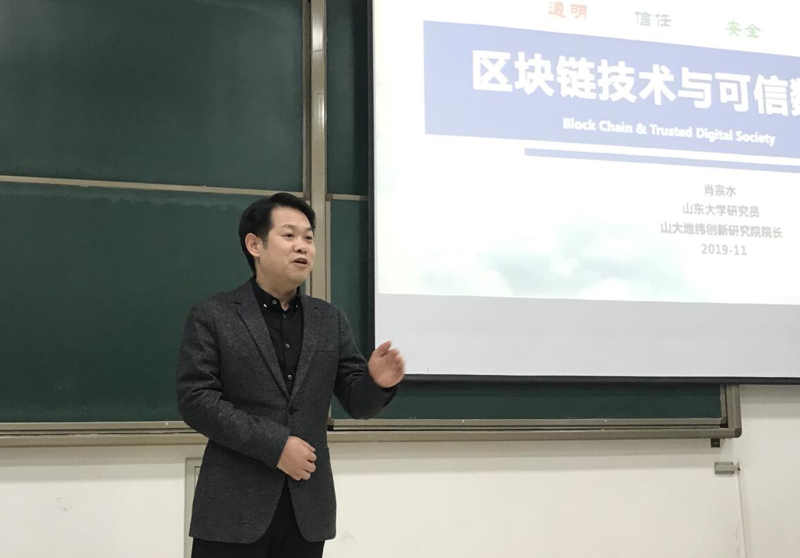 11月30日晚,山东大学中心校区知新楼C座502教室座无虚席,“齐道儒商大讲堂”之区块链技术与应用讲座火热开讲。本次讲座由山东大学管理学院副教授王军主持,邀请到了山东大学校友企业山大地纬高级副总裁、创新研究院院长肖宗水博士做为本次讲座的主讲嘉宾。