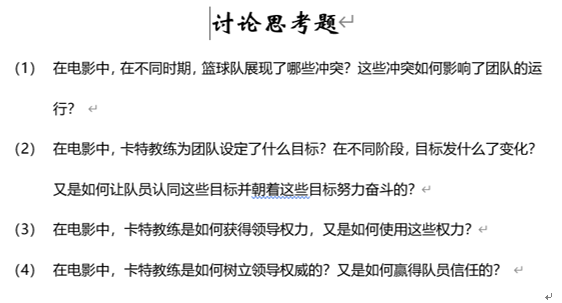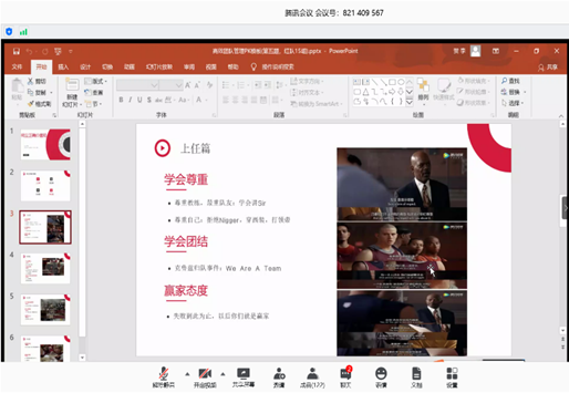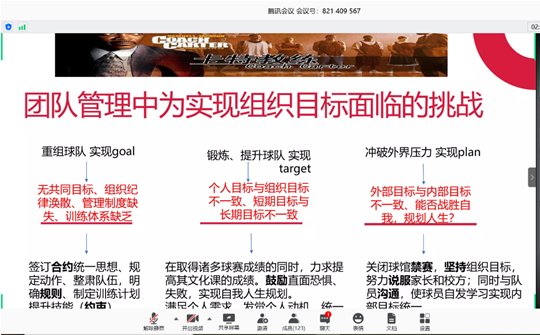 5月30-31日,在管理学院管理实验与IT服务中心支持下,100余名MBA同学参加了为期2天的线上选修课《高效团队管理》。本次课程组建20个小组,分属红蓝两大阵营,最大创新之处在于观看电影《卡特教练》并围绕团队相关思考题进行PK讨论,最后由刘冰教授和蔡地教授做精彩点评。课堂上,两位教授通过引导学生讨论分析“在电影中,卡特教练为团队设定了什么目标?在不同阶段,目标发什么了变化?“”卡特教练是如何树立领导权威的?又是如何赢得队员信任的?”等9道环环相扣的问题,为同学们回答了“如何卓有成效的管理团队”这一现实问题。